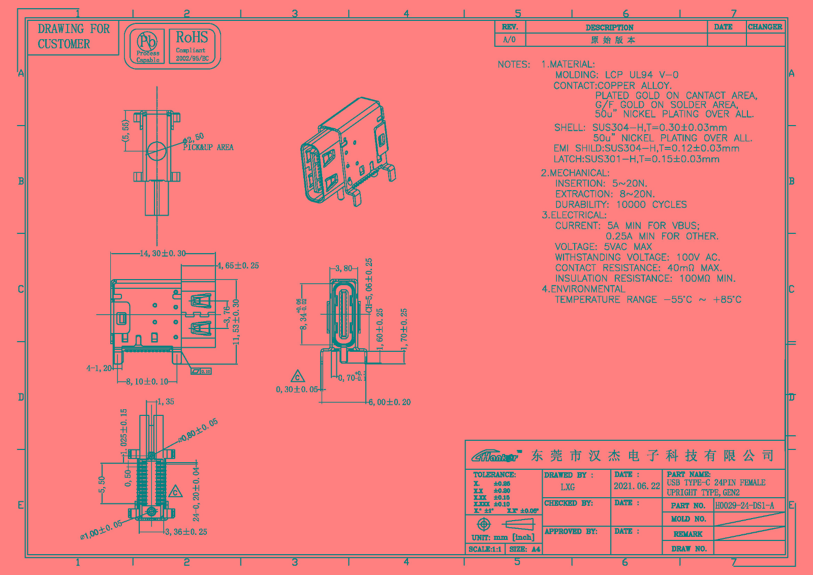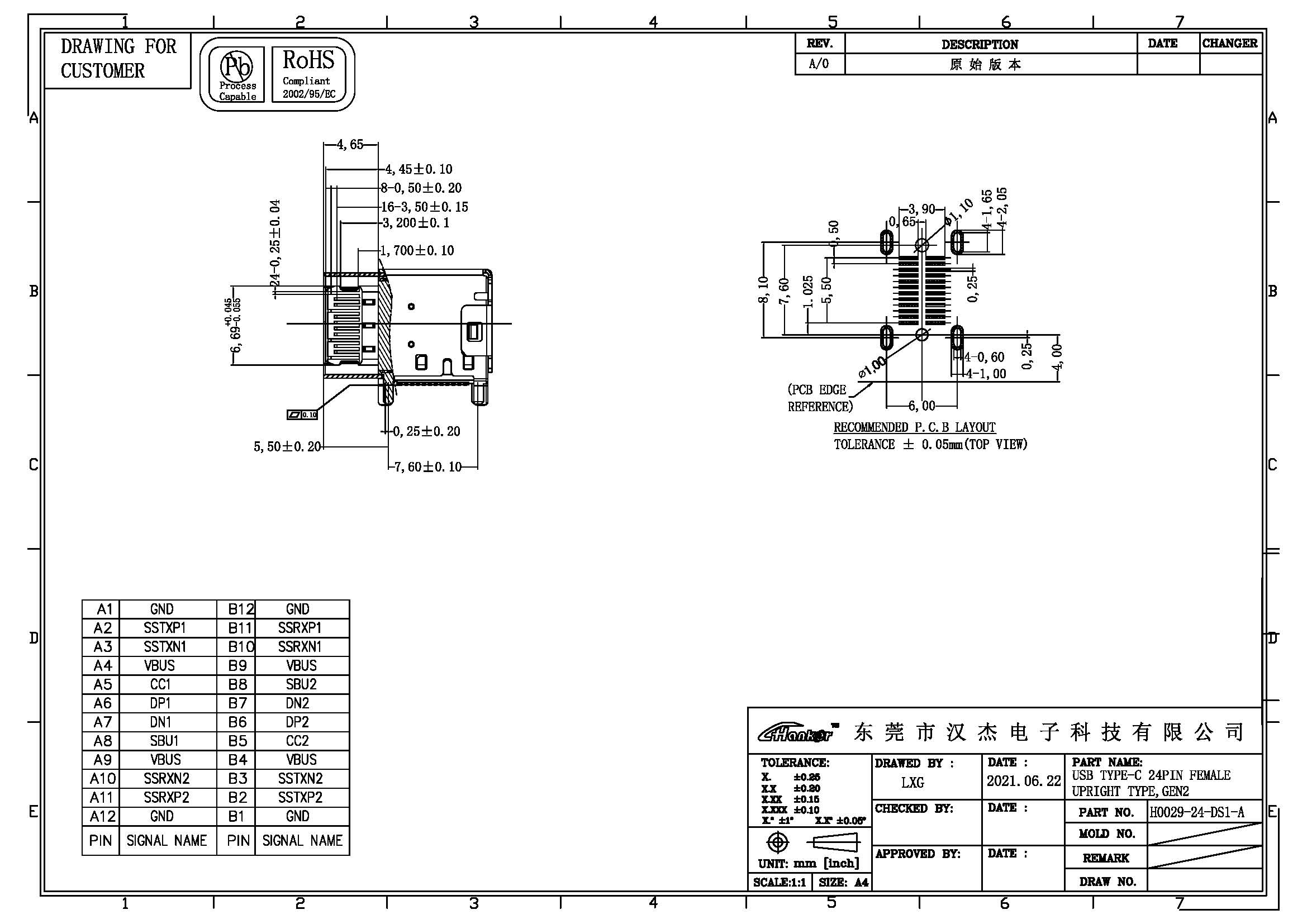 H0029-24-DS1-A USB TYPE-C 24PIN FEMALE UPRIGHT TYPE,GEN2 侧立
